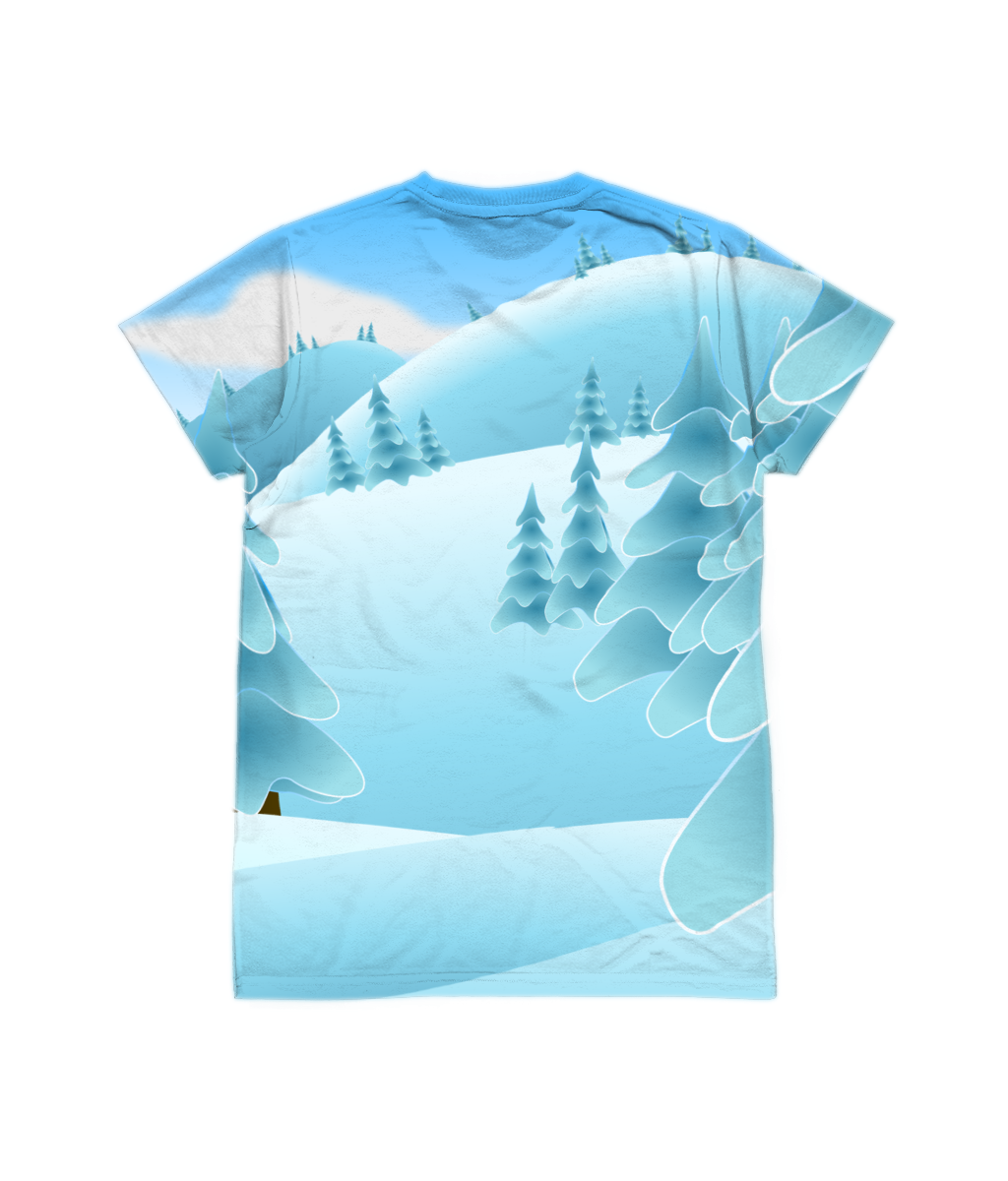 A lovely festive / winter snow scene T-Shirt – A custom all over print with reverse design on the back.